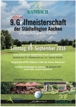 Unter der Schirmherrschaft von Städteregionsrat Helmut Etschenberg werden am Sonntag, 9. September 2018 zum 9. Mal die besten Golfer in der StädteRegion Aachen ermittelt. Die 9. StädteRegions-Trophy wird auf der Meisterschafts-Golfanlage Haus Kambach ausgetragen. Das Turnier wird offen angeboten, d.h. jeder Golfer, jede Golferin mit einem Handicap von max. 35, kann bei diesem interessanten Wettbewerb mitspielen!